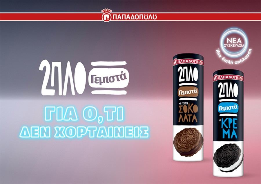 Οι συσκευασίες 2πλο Γεμιστών Παπαδοπούλου ανατρέπουν όσα γνωρίζαμε για το αγαπημένο brand, αφού πλέον  κυκλοφορούν με  έντονα χρώματα και ανανεωμένο λογότυπο που διαβάζεται οριζόντια αλλά και κάθετα! Η πρωτότυπη αυτή εμφάνιση χαρίζει στις συσκευασίες των 2πλο Γεμιστών ένα ακόμα πιο φρέσκο και μοντέρνο ύφος που ταιριάζει απόλυτα στο αγαπημένο brand των νέων και όχι μόνο. Παράλληλα διατηρούν την ίδια απίθανη 2πλη γέμιση στις δυο ξεχωριστές γεύσεις Σοκολάτα και Κρέμα που δεν «χορταίνεις» να απολαμβάνεις.