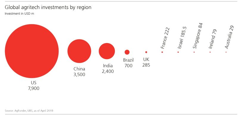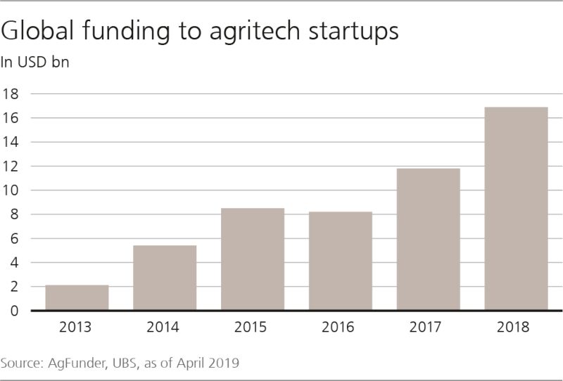 Για το σύνολο του αγροτικού κλάδου, το UBS Chief Investment Office (CIO) εκτιμά ότι το μερίδιο της τεχνολογίας θα φτάσει από το σημερινό μέγεθος της αγοράς των 135 δισεκατομμυρίων δολαρίων στα 700 περίπου δισεκατομμύρια δολάρια έως το 2030, αντιπροσωπεύοντας έναν σύνθετο ετήσιο ρυθμό ανάπτυξης της τάξης του 15%.