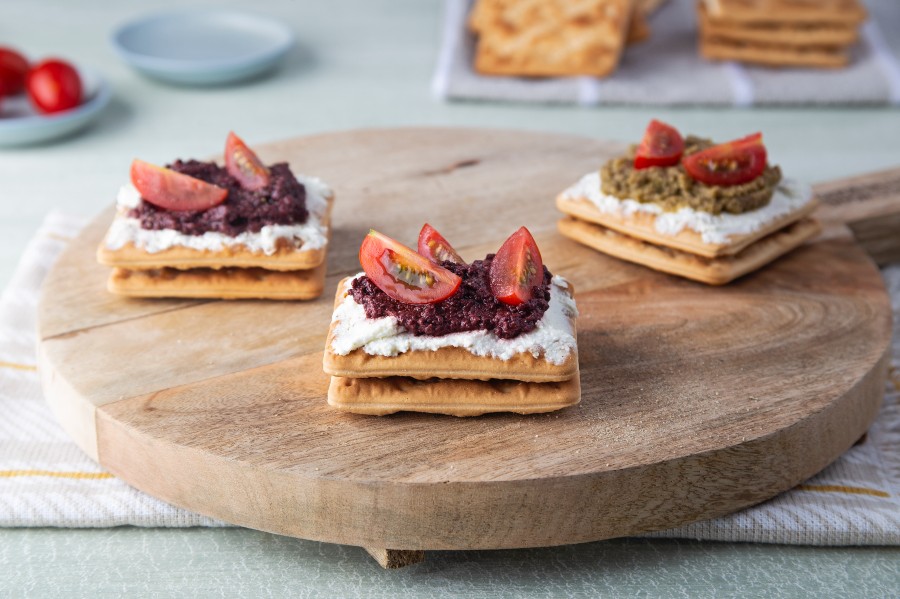 Πάνω στα Cream Crackers βάζω 1 κ.σ spread κατσικίσιου τυριού, συνεχίζω με την πάστα ελιάς και τέλος χρησιμοποιώ τοματίνια κομμένα στην μέση.