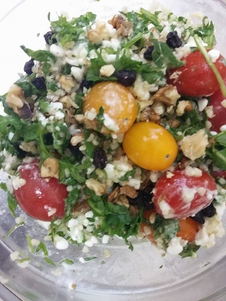 Βάζουμε το πλιγούρι σε μπολ και το σκεπάζουμε με ζεστό νερό ίσα που να το καλύπτει. Στη συνέχεια σκεπάζουμε το μπολ. Αφήνουμε το πλιγούρι να μείνει και να απορροφήσει το υγρό για 20΄-30΄. Σε ένα γυάλινο μπολ βάζετε την ψιλοκομμένη μαραθόριζα , την ψιλοκομμένη ρόκα , το πλιγούρι ( που το έχετε στραγγίξει καλά ) , αλάτι , ελαιόλαδο , ξύδι , λεμόνι και ανακατεύεται .Στην συνέχεια προσθέτετε τα καρύδια , τις σταφίδες, τα ντοματίνια και ανακατεύετε ελαφριά . Τέλος προσθέτετε το τυρί και η σαλάτα σας είναι έτοιμη .