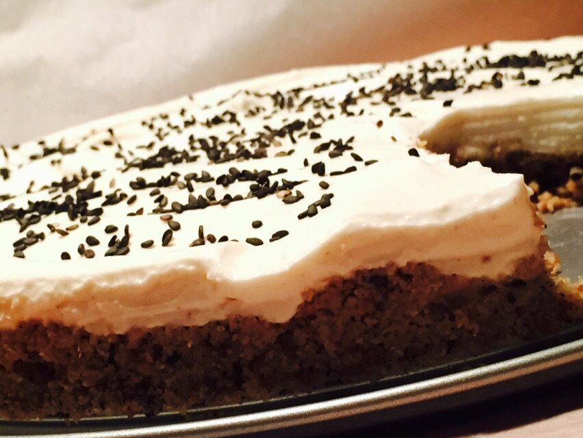 Σε ένα μεγάλο μπολ, ανάμειξε με ένα κουτάλι το μείγμα που δημιούργησες μαζί με το τριμμένο αχλάδι, το σησαμέλαιο και το μέλι μέχρι να «βραχούν» όλα τα μέρη του ξηρού μείγματος. Άδειασε και στρώσε τη βάση, η οποία θα σου φαίνεται εύπλαστη, σε μία φόρμα με αποσπώμενα τοιχώματα και άφησέ την στο ψυγείο να κρυώσει όσο θα προετοιμάζεις την γέμιση.